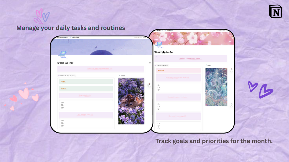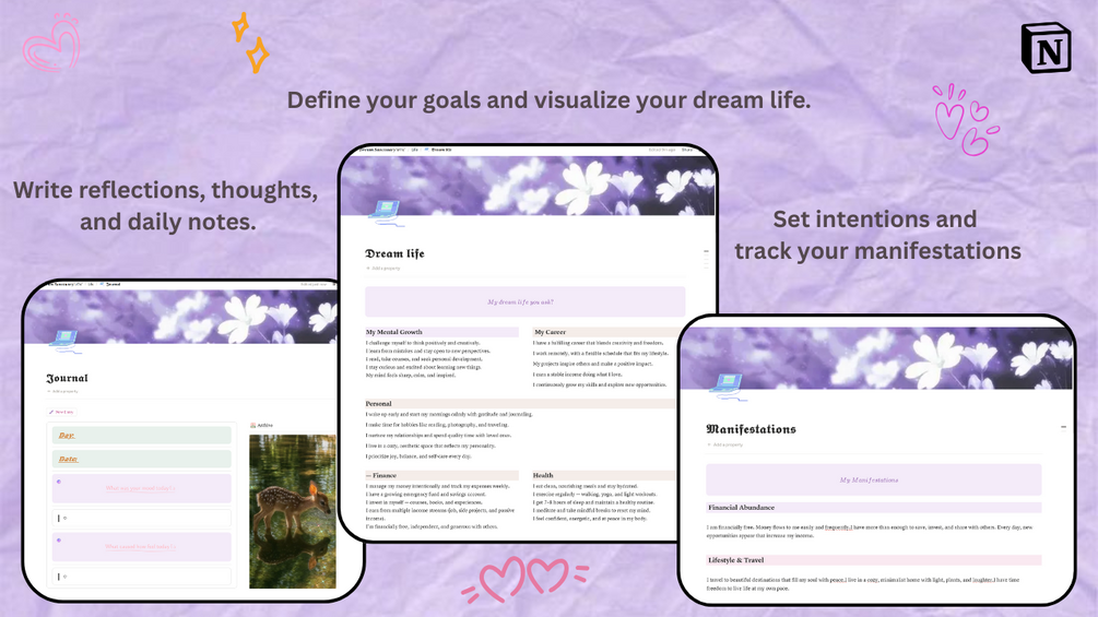 A dreamy, functional Notion template made to help you plan, reflect, and manifest with ease. Includes sections for daily and monthly planning, journaling, and visualizing your goals , perfect for creating your ideal life with clarity and peace.