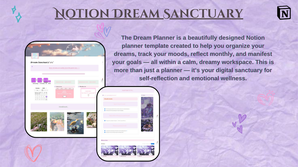 The Dream Planner is a beautifully designed Notion planner template created to help you organize your dreams, track your moods, reflect monthly, and manifest your goals — all within a calm, dreamy workspace. This is more than just a planner — it’s your digital sanctuary for self-reflection and emotional wellness.