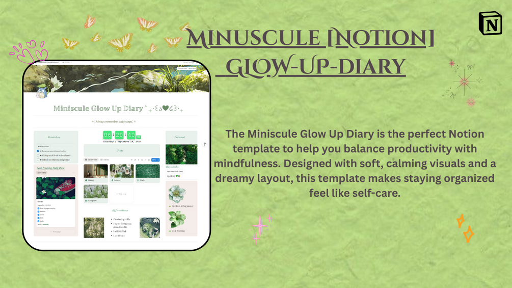 Looking for a cozy, aesthetic, and motivating way to stay on top of your goals, habits, and studies? The Miniscule Glow Up Diary is the perfect Notion template to help you balance productivity with mindfulness. Designed with soft, calming visuals and a dreamy layout, this template makes staying organized feel like self-care.